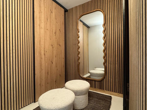 L'intérieur entièrement climatisé de l'appartement est décoré avec raffinement, dans un esprit bohème-chic, utilisant des matériaux nobles tel que le béton ciré et le chêne massif.